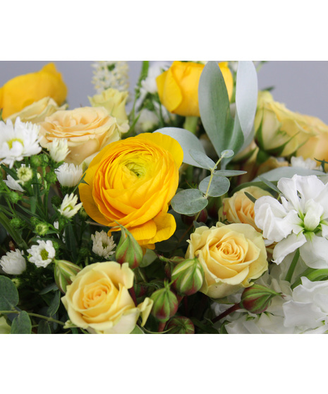 Honeysuckle is a fresh, cheerful arrangement inspired by warm light and garden abundance. Yellow ranunculus and pale yellow spray roses bring a soft, sunny glow, paired with white stock, white veronica, and delicate white monte for an airy, layered look. Lush green hydrangea adds fullness and grounding texture, while fresh greenery weaves throughout the design for a natural, garden-gathered feel. Styled in a clear glass vase, the visible stems enhance the arrangement’s organic character and keep the overall look clean and timeless. Honeysuckle brings warmth and effortless beauty to any space — light, inviting, and full of life.