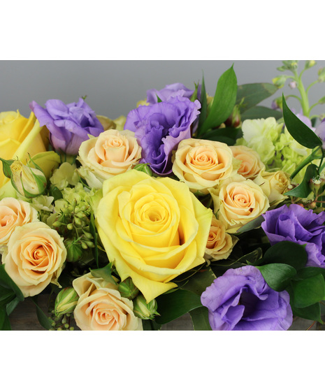 Lavender & Honey is a soft, garden-inspired arrangement that blends soothing lavender tones with warm, golden hues. Designed in a rustic wooden box, this piece feels both charming and elegant, with a natural, gathered-from-the-garden style. Featuring sunny yellow roses and delicate peach spray roses, this arrangement is beautifully complemented by lavender lisianthus and airy stems of soft purple stock. Lush greenery flows throughout, adding texture and movement while enhancing the gentle contrast between the warm “honey” tones and cool lavender shades.