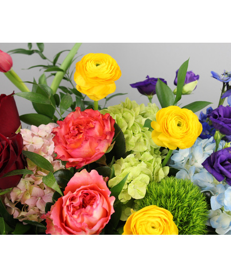 Over the Rainbow is a vibrant celebration of color, joy, and possibility. Designed in a radiant gold vessel, this striking arrangement features a rich spectrum of blooms — from passionate red roses and coral garden roses to sunshine-yellow ranunculus, lush green hydrangeas, serene blue hydrangeas, and vivid purple delphinium.