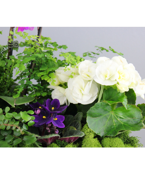 Step into a world of natural beauty with Enchanted Orchid Garden, a stunning planter that captures the elegance of a blooming garden in one charming display. Designed in a rustic wooden crate, this lush arrangement features a graceful pink orchid rising above a vibrant collection of blooming plants, including delicate kalanchoe, soft white begonia, and rich purple violets. Fresh ferns, trailing greenery, and natural moss accents add depth and texture, creating a miniature garden full of life and color.