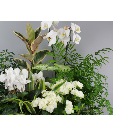 Graceful white orchids rise above a bed of greenery, complemented by delicate cyclamen, begonia, and an assortment of foliage plants including ferns, ivy, and tropical greenery. The blend of rich greens and soft white flowers creates a peaceful, garden-inspired display.