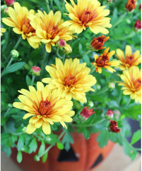 A pumpkin planter adorned with vibrant fall mums creates a delightful autumn display. The pumpkin planter serves as a rustic and charming container for the blooming chrysanthemums. The combination of the rich orange pumpkin and the warm hues of the mums captures the essence of fall, bringing a touch of seasonal beauty to any garden or outdoor space.