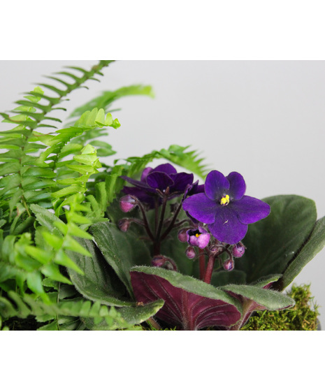 Velvet Violets & Fern is a stunning dish garden that blends elegance and lush greenery in perfect harmony. Nestled within a sleek black ceramic pot, two vibrant African violets bloom with velvety petals, their rich hues adding a touch of regal beauty. Between them, a delicate fern unfurls its feathery fronds, creating a graceful contrast with its soft, airy foliage. The deep tones of the pot enhance the vivid purples and greens, making this arrangement a captivating centerpiece. Perfect for adding charm and sophistication to any space, Velvet Violets & Fern is a timeless fusion of texture, color, and natural elegance.