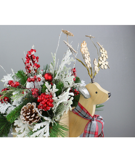 Meet Dasher, a charming handcrafted wooden reindeer that brings rustic holiday cheer to any space. Adorned with a cozy knit scarf and whimsical wooden snowflake antlers, Dasher is dressed for the season and ready to spread joy. He’s artfully accented with an arrangement of assorted silk Christmas flowers in festive reds, greens, and whites—making him a heartwarming addition to holiday décor or a memorable gift that lasts all season long.