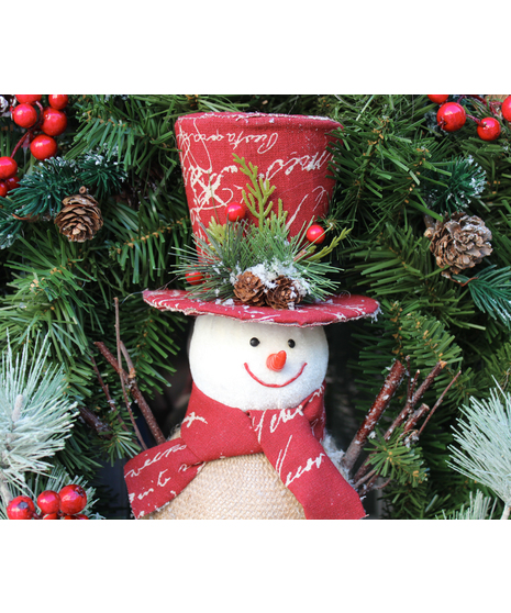 The Jolly Snowman Wreath is a festive 24" holiday decoration that brings classic winter cheer to any door or wall. This wreath features a charming snowman dressed in a black top hat and cozy scarf, nestled among clusters of red and white berries dusted with a snowy finish. Frosted white pine cones and rustic wooden snowflakes are scattered throughout, adding a touch of natural elegance and warmth. The combination of wintry textures and the playful snowman figure make this wreath a joyful accent for the holiday season, spreading cheer from the moment guests arrive.