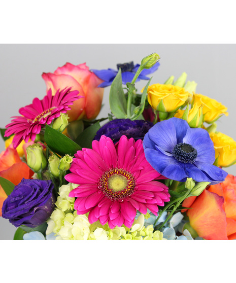 Adding a playful touch, hot pink mini gerbera daisies dot the arrangement with bursts of cheerful color, while mini green hydrangeas and blue hydrangeas contribute to the lushness and texture of the display. Israeli ruscus foliage completes the arrangement, its graceful tendrils adding depth and movement.