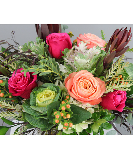 Playful yet refined, Cabbage Patch celebrates the beauty of fall with a lush blend of textures and colors. Designed in a clear glass vase, this arrangement features ruffled ornamental kale paired with vibrant Cherry Oh roses and soft peach Kahala roses. Safari Sunset and antique green hydrangea add depth and richness, while assorted greenery provides a fresh, natural finish. Perfect for autumn gatherings or everyday décor, Cabbage Patch brings a charming harvest touch to any space.