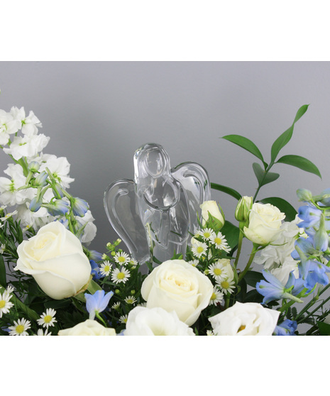 Honor a cherished memory with Angel’s Embrace, a serene sympathy arrangement featuring a delicate crystal angel. This thoughtfully designed, one-sided arrangement is presented in a simple plastic container and showcases soothing shades of light blue and white. Soft blue delphinium, pristine white stock, roses, Monte Casino, spray roses, and lisianthus are beautifully arranged with lush greenery to create a peaceful, comforting tribute that conveys love, remembrance, and heartfelt sympathy.