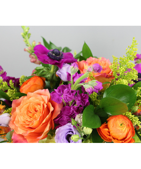 Bahama Mama is a vibrant, tropical-inspired arrangement bursting with bold color and lively texture. Designed in a rich cobalt glass vase, this eye-catching piece features a radiant mix of fiery orange roses and ranunculus, vivid magenta anemones, soft lavender blooms, and fresh green hydrangea at its base.