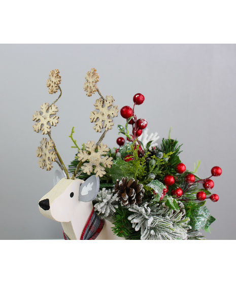 "Introducing our unique Silk Blitzen Reindeer, a one-of-a-kind creation handcrafted and hand-painted by our talented in-store designers. This enchanting reindeer brings the magic of winter indoors with its elegant design. Adorned with red iced berries and winter greens, it captures the essence of the season. The antlers, made from intricately designed wooden snowflakes, add a touch of whimsy and natural charm. Completing the look, a cozy plaid scarf adds a dash of warmth to this delightful winter creation. The Silk Winter Reindeer is not just a decoration; it's a piece of art that brings the beauty of the season into your home."