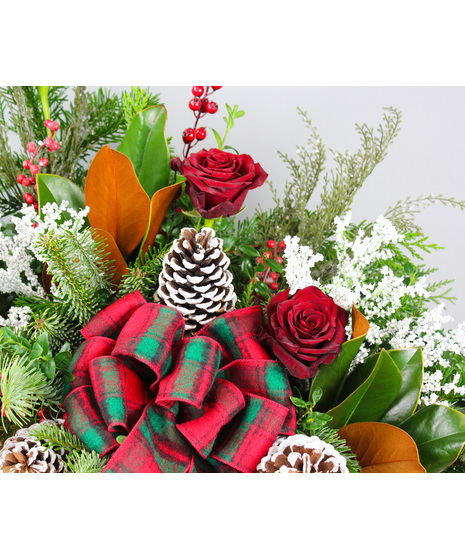 Capture the joy and wonder of the holiday season with Sleigh Ride, a festive arrangement bursting with Christmas charm. Designed in a large red sleigh and adorned with a cheerful plaid bow, this piece features an abundance of assorted evergreens accented by rich red Heart roses, sparkling opal pinecones, a cedar berry spray, and frosted snowy branches. Perfect as a show-stopping centerpiece or a warm holiday welcome, Sleigh Ride evokes the magic of a wintry journey through a snowy forest.