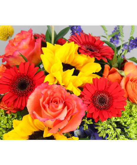 Magical Fall is a vibrant autumn silk arrangement bursting with color and texture. Purple and mini green hydrangeas mingle with cheerful sunflowers, Free Spirit roses, orange spray roses, red Gerbera daisies, purple veronica, and playful billy balls, all artfully arranged in a clear green glass cylinder. This enchanting centerpiece brings the lively, whimsical beauty of fall into any space, making it perfect for brightening tables, mantels, or entryways.