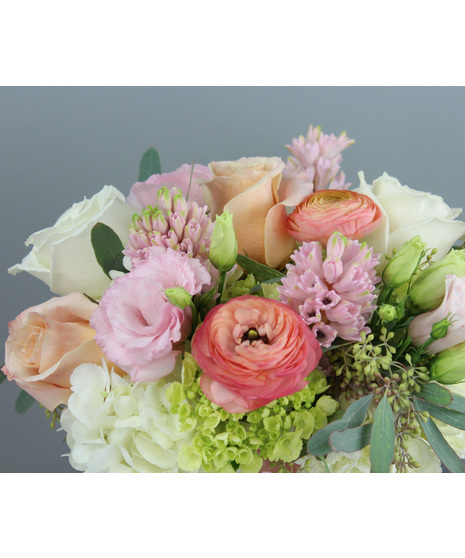 Blossom is a joyful celebration of spring and Easter, designed in a soft blush glass vase that perfectly complements its fresh seasonal palette. This lush arrangement features peach and ivory roses, vibrant coral ranunculus, delicate pink lisianthus, and textured green hydrangeas, all accented with fresh greenery for a natural garden feel. The combination of warm pastels and soft greens evokes blooming gardens, sunny afternoons, and the fresh start that spring brings. Compact yet abundant, Blossom makes a beautiful centerpiece for Easter brunch, a thoughtful holiday gift, or a charming way to welcome the new season.