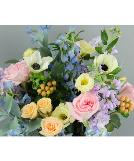 Fairytale is a dreamy blend of soft pastels and garden charm, designed to feel like something straight from a storybook. Arranged in a delicate blush pink vase, this enchanting composition features romantic pink roses, buttery yellow blooms, airy lavender stock, soft blue hydrangeas, and touches of fresh greenery for natural movement and texture. Hints of light blue delphinium and delicate accent florals add whimsy and depth, creating a design that feels both magical and effortlessly elegant. The gentle mix of pinks, lavenders, yellows, and blues brings a sweet, springtime glow to any space.