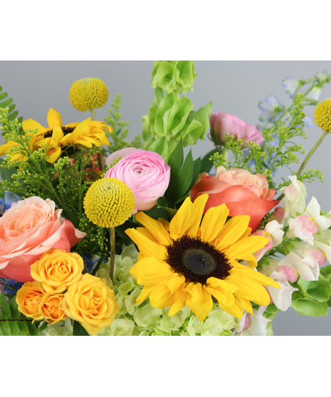 Funfetti is a joyful burst of color and texture, designed to feel as festive and playful as its name. Arranged in a clean white vase, this lively piece features cheerful sunflowers at the center, surrounded by a bright mix of peach and yellow roses, soft pink ranunculus, and fresh green hydrangea.