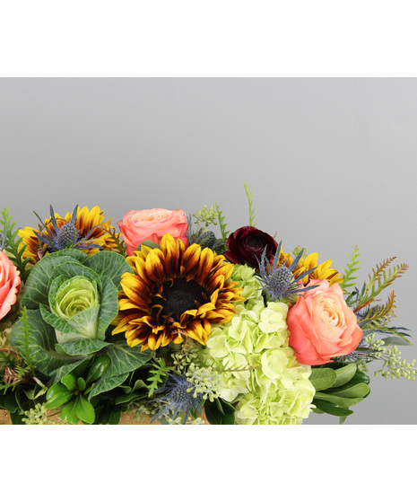 Glowing with the rich beauty of the season, Harvest Moon is an elegant fall arrangement designed in a gold ceramic rectangular container. Lush green hydrangea and ornamental kale provide a textured backdrop for flame sunflowers, peach Kahala roses, and burgundy ranunculus. Accents of blue thistle and seeded eucalyptus add depth and contrast, creating a perfect balance of color and form. Radiant and refined, this arrangement captures the golden glow of autumn and makes a stunning centerpiece for any seasonal celebration.
