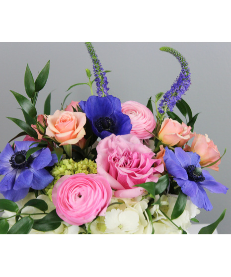 Lush white hydrangea and mini green hydrangea create a cloud-like foundation, while country blue roses and striking blue anemones add depth and a touch of elegance. Pink ranunculus and peach spray roses bring in gentle, loving tones, perfectly balanced with airy Italian ruscus tips for a natural, organic finish.