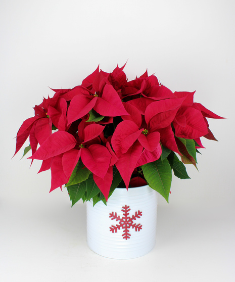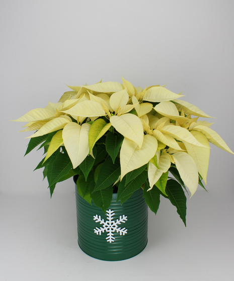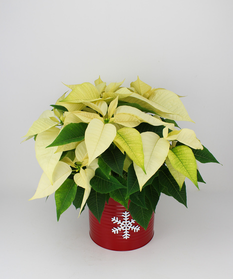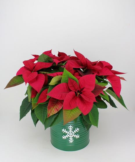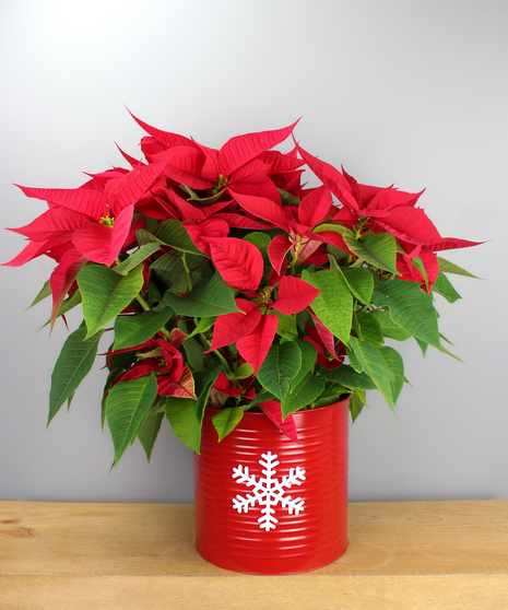 A stunning Poinsettia plant nestled in a festive Christmas tin. Color of Poinsettia subject to availability.