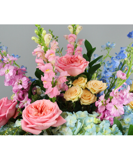 A lush base of blue hydrangea sets a rich, serene tone, while light blue delphinium reaches upward, adding airy elegance and dimension. Luxurious pink expression garden roses and creta spray roses bring fullness and texture, complemented by the soft vertical lines of pink snapdragons and the delicate fragrance of light pink stock. Accents of Israeli ruscus and gunni eucalyptus weave throughout, adding a fresh, natural finish with a touch of modern greenery.