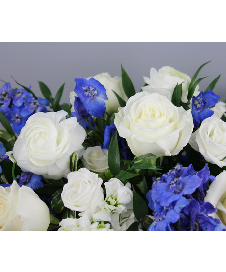 Elegant and enchanting, Sapphire Snowfall evokes the beauty of a crisp winter evening. Designed in a clear rectangular glass vase lined with a graceful green leaf wrap, this centerpiece showcases a stunning mix of white stock, white ranunculus, white lisianthus, and rich dark blue delphinium. Accented with fresh assorted greenery, it’s the perfect blend of cool sophistication and festive charm — ideal for winter celebrations or Hanukkah gatherings.