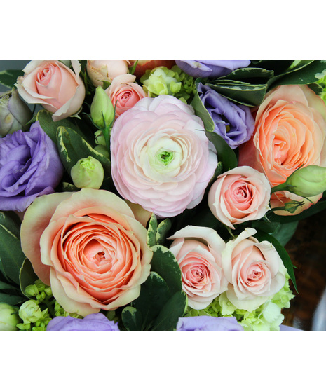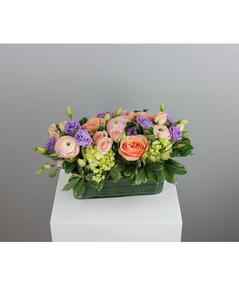 Sip and Bloom is an elegant pairing of fresh florals and your favorite bottle, designed to delight both the senses and the moment. This long and low arrangement features a lush mix of premium blooms—soft blush and peach roses, delicate ranunculus, and pops of lavender lisianthus—artfully styled with fresh greenery in a clear glass vase.