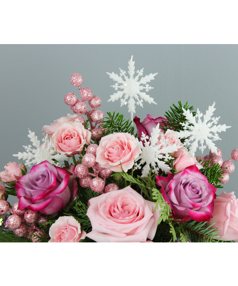 The Sugar Plum arrangement is a whimsical winter delight, designed to bring sparkle and sweetness to the season. Soft pink roses, lavender roses, and delicate spray roses nestle among lush holiday evergreens, creating a romantic blend of color and texture. Glittering pink berries, shimmering ornaments, and sparkling snowflake accents add a festive, magical touch reminiscent of a winter fantasy. Arranged in a sleek silver cube vase, this enchanting design captures the charm of the holidays with a playful, elegant twist—perfect for gifting, decorating, or adding a touch of frosted beauty to any space.