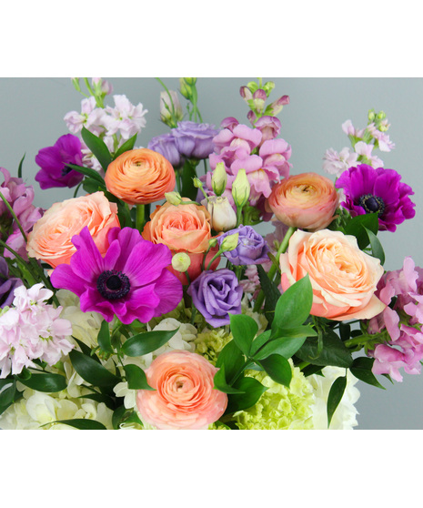 A lush base of white hydrangea and mini green hydrangea creates fullness and texture, while lavender snapdragons and soft pink stock add height and a gentle garden feel. Peach Kahala garden roses and peach ranunculus bring warmth and sophistication, perfectly contrasted by the striking, jewel-toned fuchsia anemones. Lavender lisianthus adds a delicate, airy touch, while Italian and Israeli ruscus tips weave throughout for a fresh, natural finish.