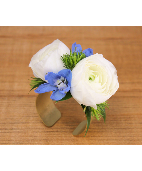 White Ranunculus & Light Blue Delphinium Cuff Wristlet