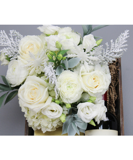 Indulge in the elegance of the season with our Winter Royal Treatment gift crate. This luxurious set features a handcrafted floral arrangement designed in a 5"x5" clear glass cylinder, overflowing with winter-white beauty. Soft white hydrangea, velvety roses, delicate ranunculus, and graceful lisianthus are paired with dusty greenery and flocked, glittered evergreens for a frosted, enchanting look. White glittered snowflakes add the perfect sparkling touch, creating a truly regal winter display.