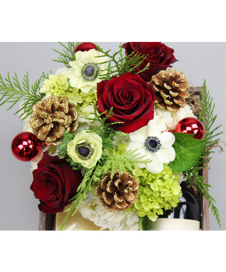 Indulge in the elegance of the season with our Holiday Royal Treatment gift crate—a luxurious blend of festive beauty and gourmet delight. Nestled inside a rustic wooden crate, this gift features a stunning floral arrangement designed in a classic 5"x5" clear glass cylinder. Lush white hydrangea and mini green hydrangea create a soft, wintry base, accented by rich red roses, striking white anemones, sparkling gold glittered pinecones, vibrant red Christmas balls, and fresh Leyland greenery for a touch of holiday grandeur.