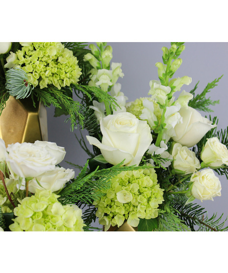 The Golden Evergreen Trio is a stunning collection of three coordinated arrangements designed to bring elegance, freshness, and a touch of modern luxury to any space. Displayed in faceted gold geometric vases, each piece features a harmonious blend of creamy white roses, spray roses, white snapdragons, and vibrant green hydrangea. Rich seasonal evergreens add texture, depth, and a festive winter feel. Styled at varying heights for visual interest, this trio creates a graceful, sculptural presence—perfect for holiday gatherings, entryway décor, or as a sophisticated centerpiece set. Clean, contemporary, and radiant, the Golden Evergreen Trio brings timeless beauty with a modern edge.