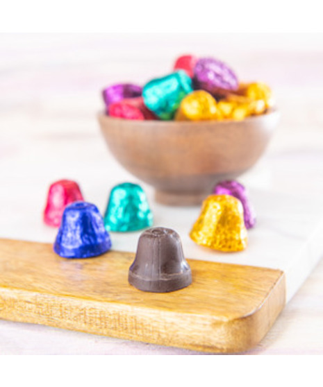 Bite sized solid dark chocolate bells, wrapped in foil. Great for party favors, candy jars or Christmas stockings.