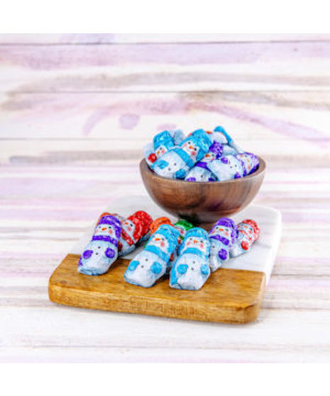 Bite sized solid milk chocolate Snowmen, wrapped in foil, featuring assorted designs. Great for party favors , candy jars or Christmas stockings! 5oz Bag