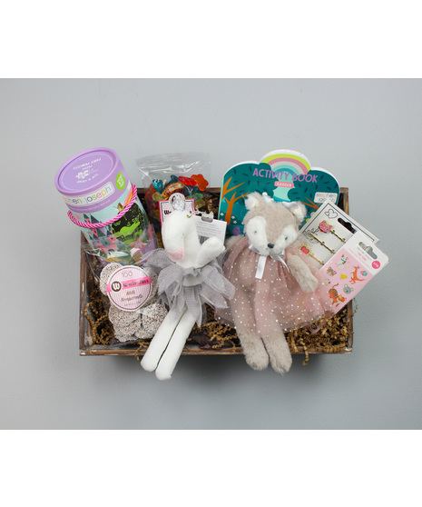 Step into a world of sparkle, imagination, and sweet surprises with Once Upon a Playtime — a charming gift crate designed for little dreamers who love princesses, animals, and magical adventures. Inside, she’ll discover a graceful swan princess plush and a darling deer friend dressed in shimmer, ready for endless make-believe moments. A princess castle puzzle and garden sticker activity book invite creative play, while animal hair pins and fun nail stickers add a touch of dress-up delight.
