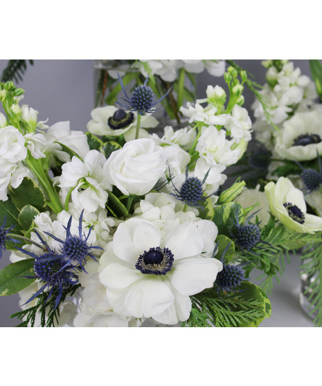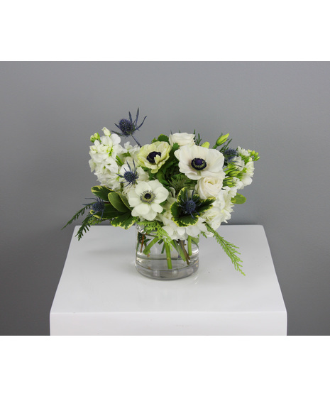 Inspired by the shimmering beauty of winter skies, the Northern Lights Trio brings a touch of seasonal magic to any setting. Each of the three 4"x4" clear glass cylinder vases features a lush blend of white stock, white anemones, and white lisianthus, accented with blue thistle and fresh Leyland greenery. Together, these elegant arrangements create a serene and luminous display — perfect for winter celebrations or Hanukkah gatherings.