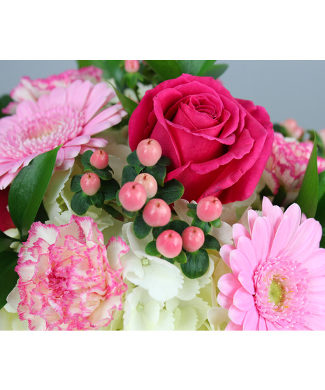 Honey Bun Valentine’s Arrangement is a sweet and romantic floral design perfect for Valentine’s Day or any love-filled occasion. This charming arrangement features lush white hydrangea paired with hot pink roses, light pink mini gerbera daisies, and vibrant Rendezvous carnations for a beautifully layered pink-and-white palette. Accents of coco hypericum berries add texture and warmth, while fresh Israeli ruscus greens provide a vibrant, natural finish. Designed in a clear glass vase, Honey Bun is a modern yet timeless floral gift that expresses love, affection, and heartfelt sweetness. Ideal for Valentine’s Day flowers, anniversaries, or romantic surprises.