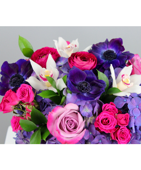 Main Squeeze is a bold, modern Valentine’s Day arrangement that brings the drama and the romance. Designed in a sleek, glossy hot-pink container, this lush mix features rich purple hydrangea as the base, layered with vibrant pink roses (including spray roses), striking deep violet anemones, and elegant white cymbidium orchids. Fresh green foliage adds contrast and keeps the look crisp and polished. The result is playful yet sophisticated—full of color, texture, and attitude. It’s the perfect “main squeeze” kind of gift: eye-catching, heartfelt, and impossible to ignore.
