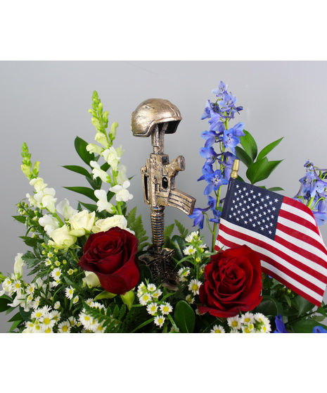 The Military Tribute sympathy arrangement is a dignified and heartfelt honor to a life lived in service. Designed with classic red, white, and blue tones, this arrangement features rich red roses, soft white roses, delicate white daisy accents, and striking blue delphinium, all nestled among lush greenery.