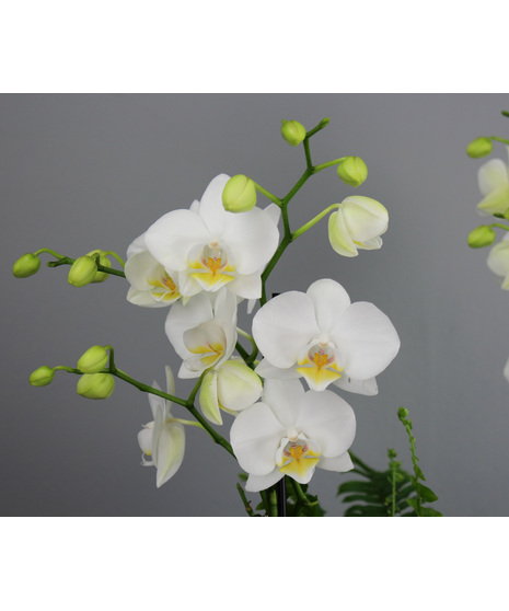 Graceful Orchid Garden is a refined and tranquil arrangement that beautifully blends elegance with natural charm. Featuring pristine white orchid blooms rising delicately above lush greenery, this design exudes a sense of purity and sophistication. The orchids’ soft petals and gentle yellow centers create a serene focal point, while their arching stems add height and graceful movement.