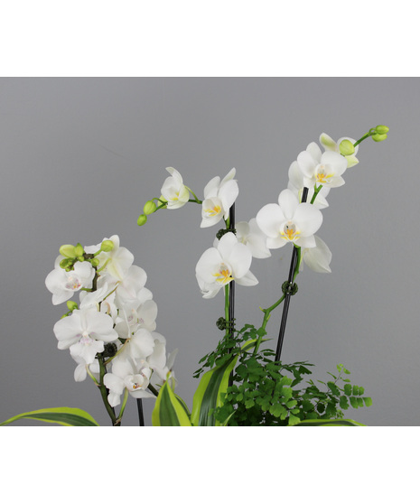Complementing the orchids are the bold, variegated leaves of a Dracaena ‘Lemon Lime’, paired with delicate, airy Maidenhair fern (Adiantum) for a soft, natural texture. Accented with fresh green foliage and natural moss, this dish garden creates a harmonious balance of structure and serenity.