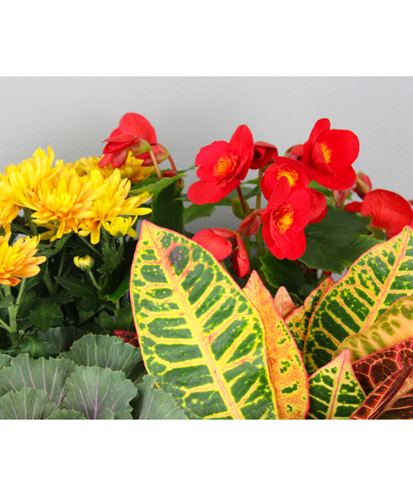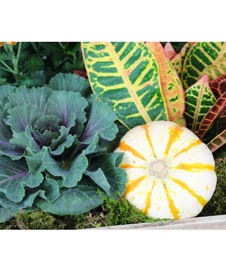 The Farmhouse Crate is a charming, rustic arrangement that brings the best of the fall season to life. This wooden crate is filled with an eye-catching mix of autumnal favorites: vibrant, assorted colored mums, begonias in fiery reds and oranges, lush purple and green kale, and a cute mini pumpkin to top it off. Perfect for a porch or tabletop, this cozy, farmhouse-inspired crate captures the essence of harvest season with its rich textures and warm hues, making it an ideal gift or decorative accent for any fall celebration.