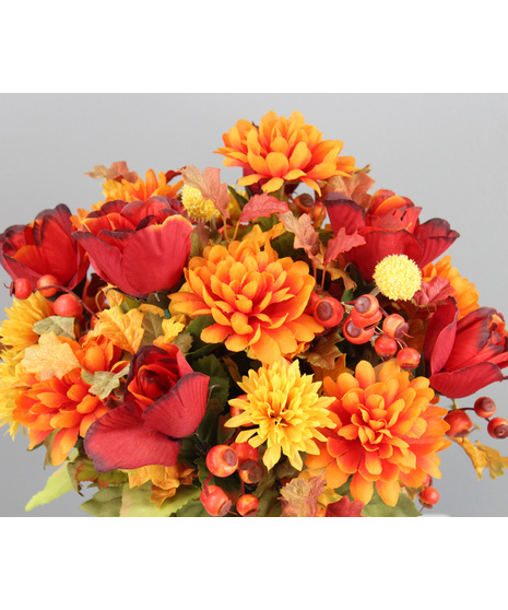 Golden Harvest is a radiant celebration of autumn’s bounty. Arranged in a golden yellow ceramic pot, this silk floral display features vibrant red tulips, bright marigolds, and cheerful orange berries, accented with textured craspedia and colorful fall leaves. Bursting with warm, golden tones, Golden Harvest brings the essence of the season indoors, creating a cheerful and timeless centerpiece full of autumnal charm.