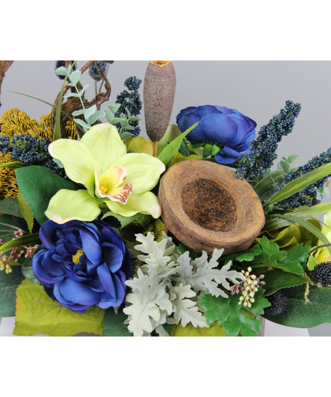 Forest Breeze is a serene and elegant silk floral arrangement that evokes the calming beauty of a woodland escape. Displayed in a rustic brown wooden box, this arrangement features striking green cymbidium orchids and vibrant blue roses, complemented by textured blue thistle, assorted pods, and soft dusty miller. Lush greenery adds depth and natural movement, creating a harmonious composition that feels fresh, tranquil, and timeless—a perfect way to bring the peaceful essence of the forest into any space.