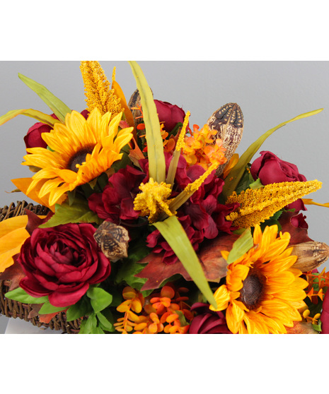 Season of Plenty is a timeless silk cornucopia overflowing with the rich beauty of autumn. Bursting with golden sunflowers, deep red roses, rustic pods, and an abundance of fall foliage, this piece captures the warmth and abundance of the harvest season. Perfect as a centerpiece or seasonal accent, it brings lasting beauty to your home year after year.