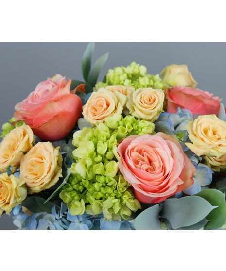Cape Cod captures the relaxed elegance of a seaside escape, blending soft coastal hues with classic garden blooms. Arranged in a clear glass cylinder vase, this lush design features airy blue hydrangeas reminiscent of ocean waves, fresh green hydrangeas for texture, and a beautiful mix of peach and buttery yellow roses that glow like a summer sunset along the shore.