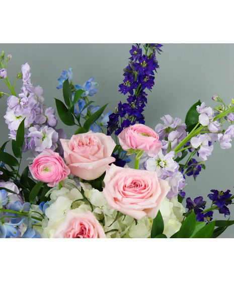 Sweet Wisteria is a soft celebration of spring, inspired by the gentle beauty of cascading wisteria in full bloom. Featuring delicate shades of lavender, pastel pink, and airy blues, this arrangement blends lush hydrangeas, elegant roses, and seasonal blossoms with fresh greenery for a light, garden-fresh feel.