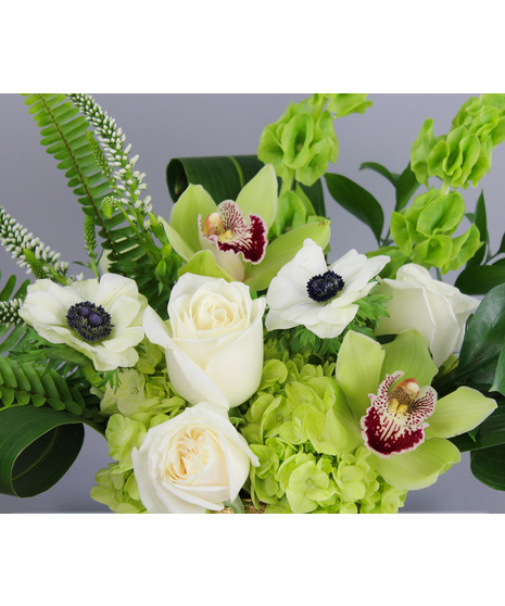 Irish Meadow captures the lush beauty of Ireland’s rolling countryside in a refined, modern design. Arranged in a textured gold vessel, this striking composition features vibrant green hydrangeas, elegant white roses, delicate anemones, and exotic green cymbidium orchids. Accents of fresh ferns, sculpted tropical leaves, and seasonal greenery create movement and depth, evoking the feeling of a windswept meadow in full bloom.