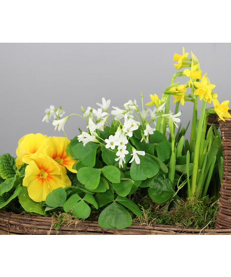 Sunny yellow daffodils rise gracefully at the center, bringing height and a joyful pop of color. Surrounding them are soft white blossoms that add elegance and contrast, while rich green leaves and shamrock-inspired accents create a fresh, garden-picked feel. Golden pansy blooms spill gently along the sides, enhancing the arrangement with warmth and charm.