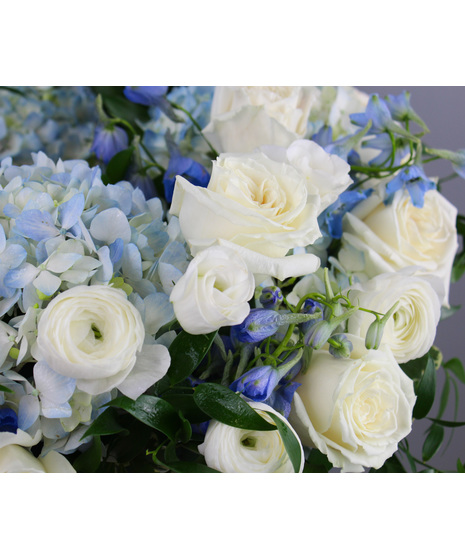 Celebrate the memory of your loved one with the Azure Embrace Wreath, a 15-inch tribute that exudes elegance and tranquility. This beautifully crafted wreath features a harmonious blend of blue hydrangeas and light blue delphiniums, symbolizing serenity and peace. The purity of white roses, ranunculus, lisianthus, and trachelium adds a touch of grace and timeless beauty. Accented with assorted lush greenery, the Azure Embrace Wreath creates a gentle, comforting display that honors a life well-lived and cherished. Perfect for cremation ceremonies, this wreath offers a heartfelt expression of love and remembrance.
