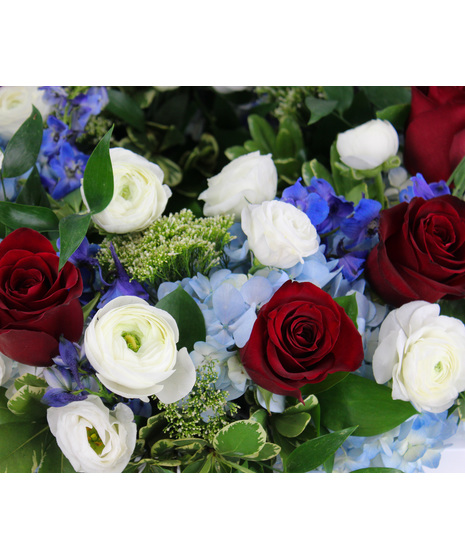 Freedom Ring is a 15" cremation wreath that honors a life of courage, pride, and remembrance. This elegant tribute features a patriotic blend of blue hydrangea, red roses, dark blue delphinium, white ranunculus, and white lisianthus, surrounded by lush assorted greenery. The rich, vibrant colors symbolize strength, love, and peace, creating a beautiful expression of devotion and gratitude. Freedom Ring serves as a heartfelt memorial, celebrating a life lived with honor and the enduring spirit of freedom.